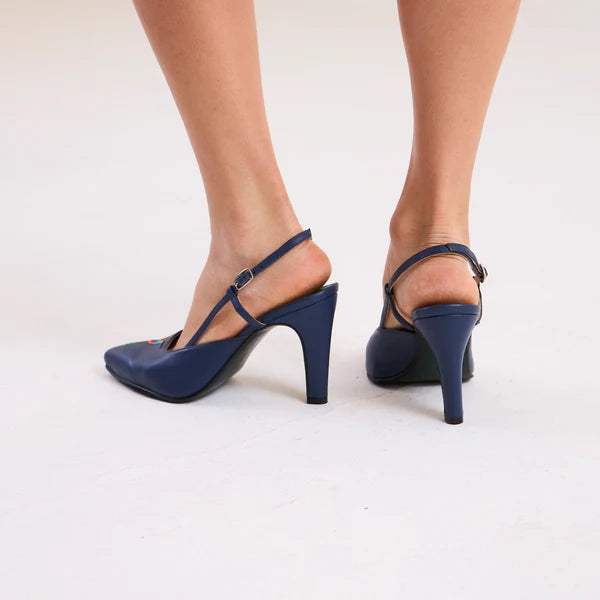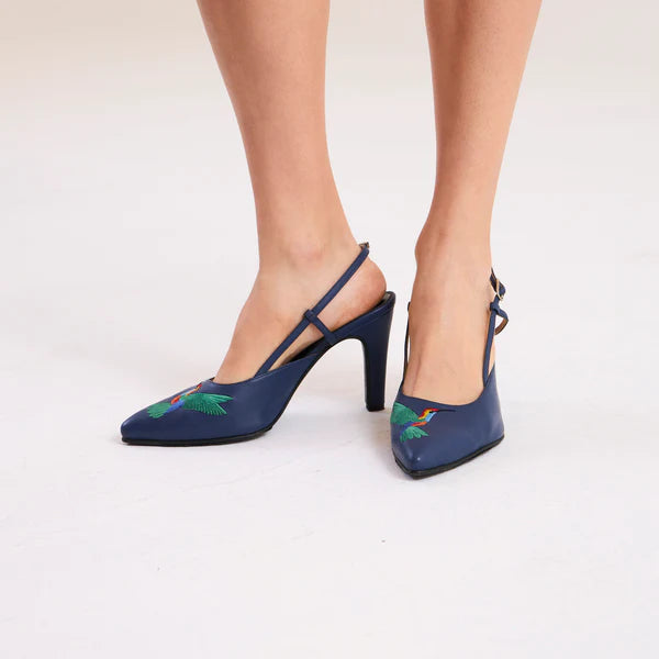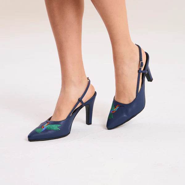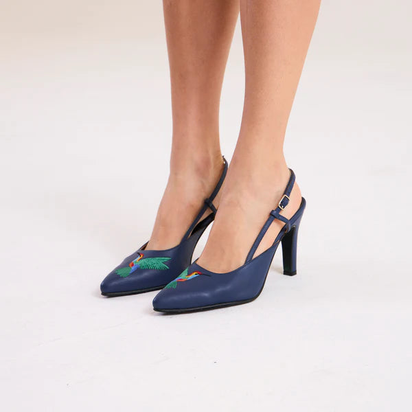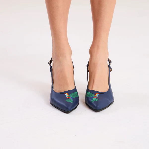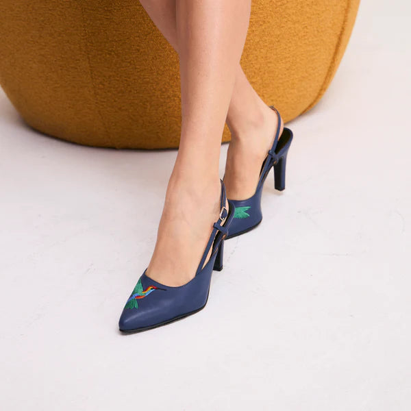 El zapato Aya se caracteriza por su colibrí bordado a mano en el cuero, lo que lo hace único. Forrado completamente en cuero natural y con suela también en cuero, ofrece una sensación de suavidad y firmeza en cada paso. El taco de 7,5 cm estiliza la figura sin comprometer la estabilidad.